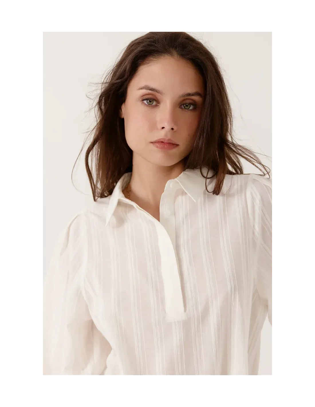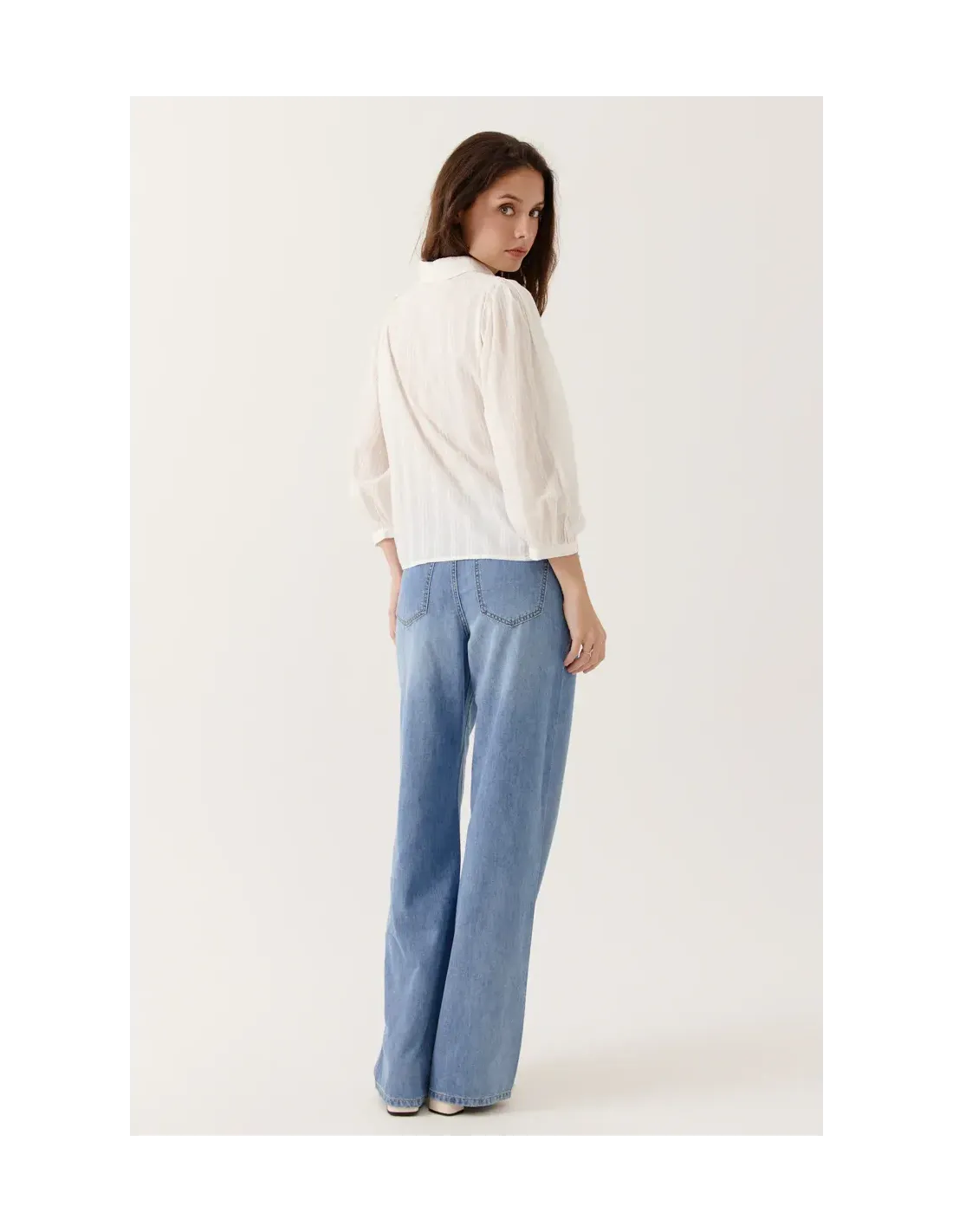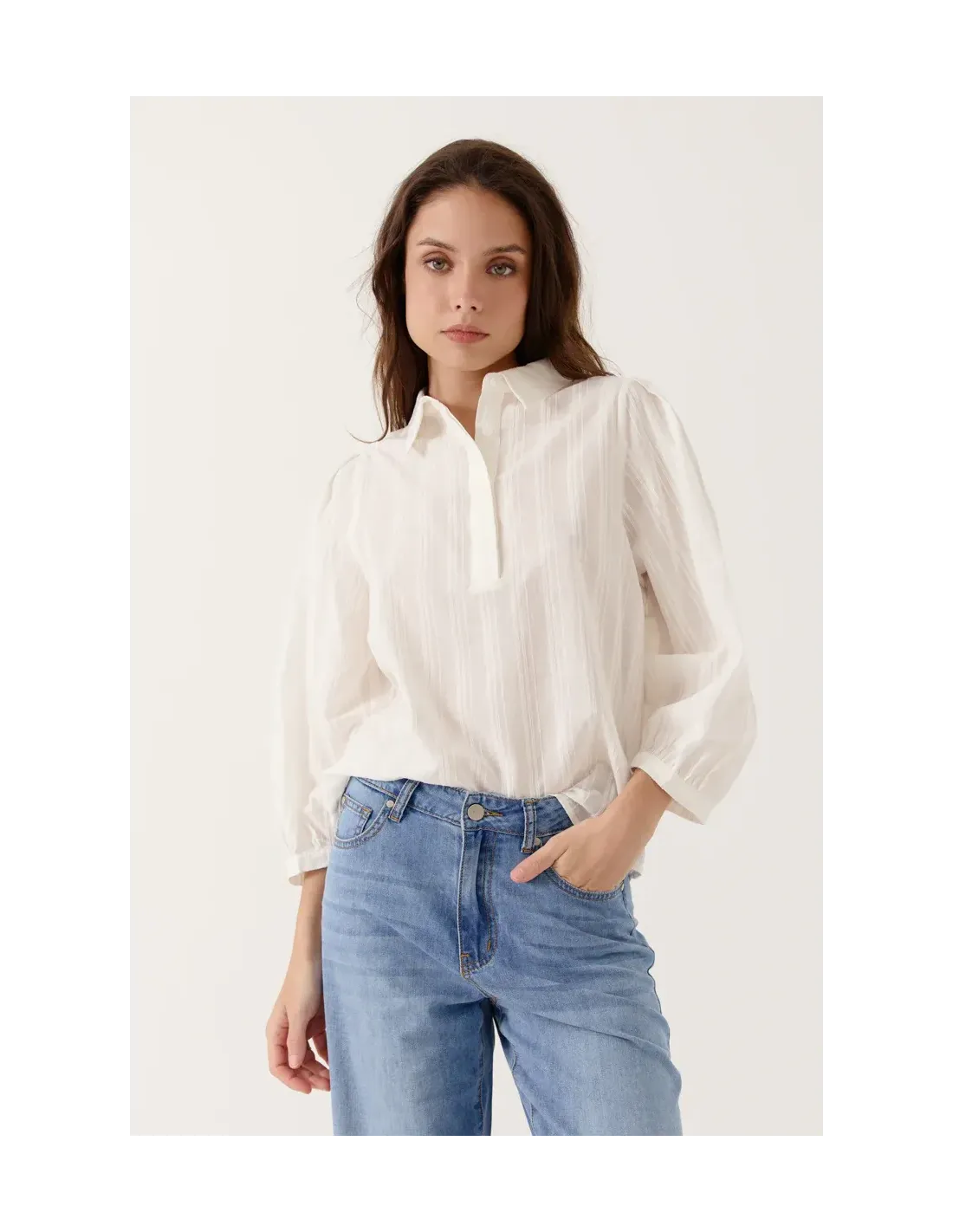 Blouse col chemise, manches 7/8 légèrement bouffantes. Epaules subtilement structurées.