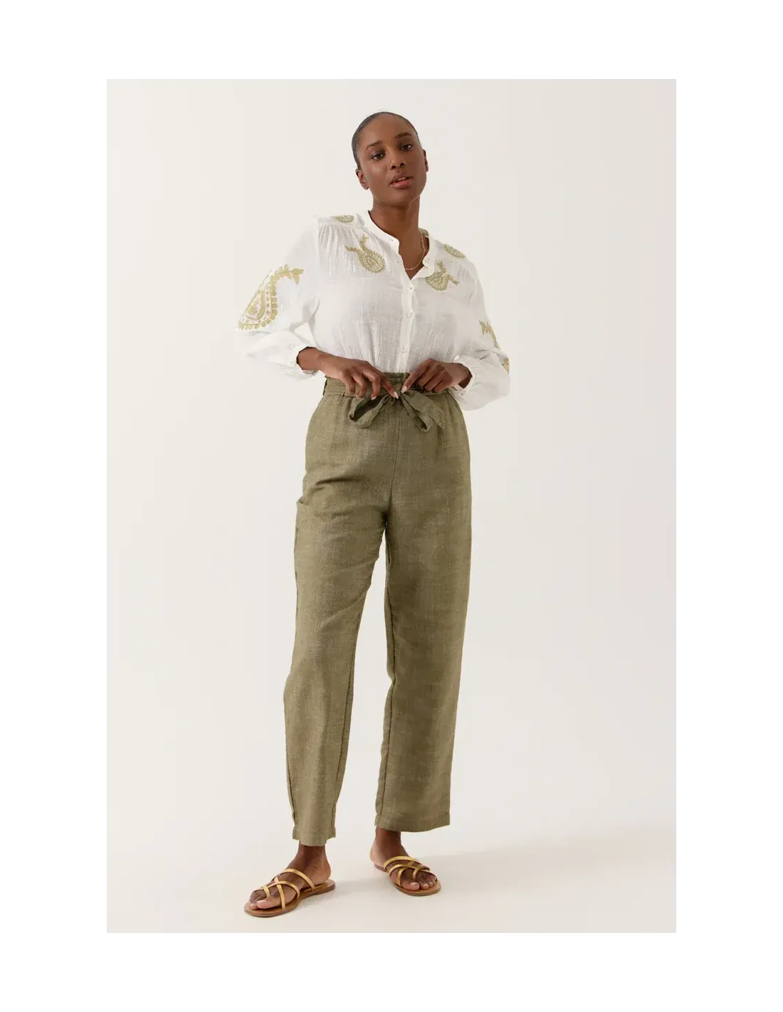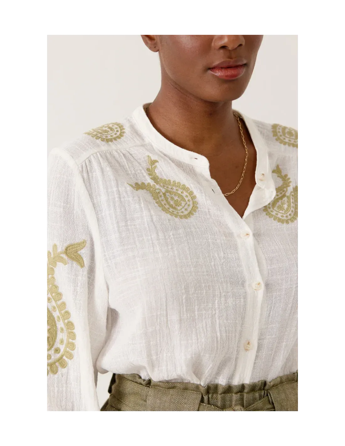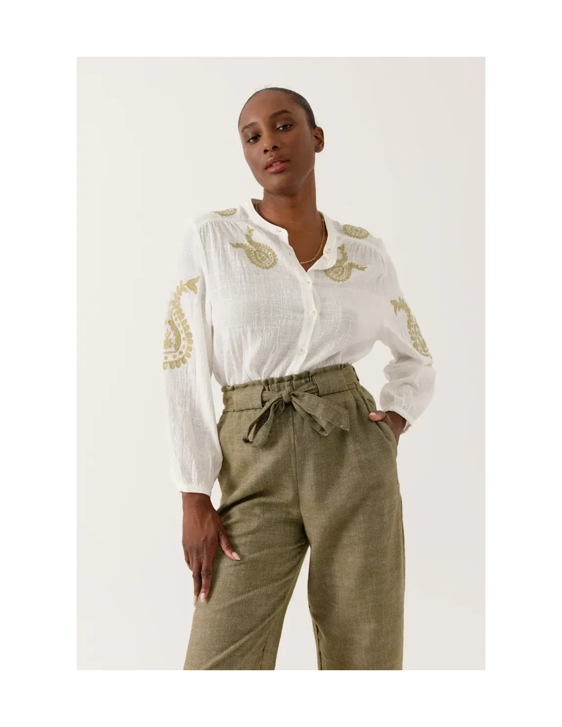 Laissez-vous séduire par cette blouse en voile léger, une pièce d'une finesse absolue. Son encolure ronde laisse place à un délicat jeu de broderies placées, véritables signatures de ce modèle. Ses manches bouffantes resserrées aux poignets apportent un volume aérien et romantique, tandis que sa boutonnière délicate souligne une silhouette à la fois classique et sophistiquée.
