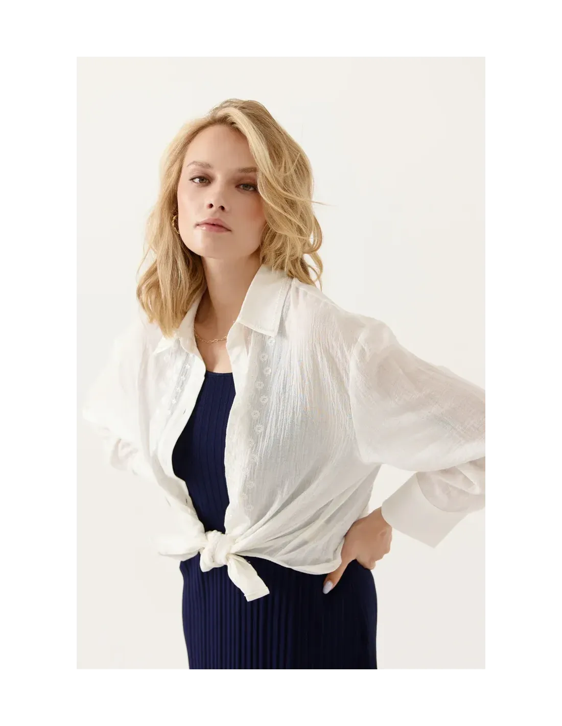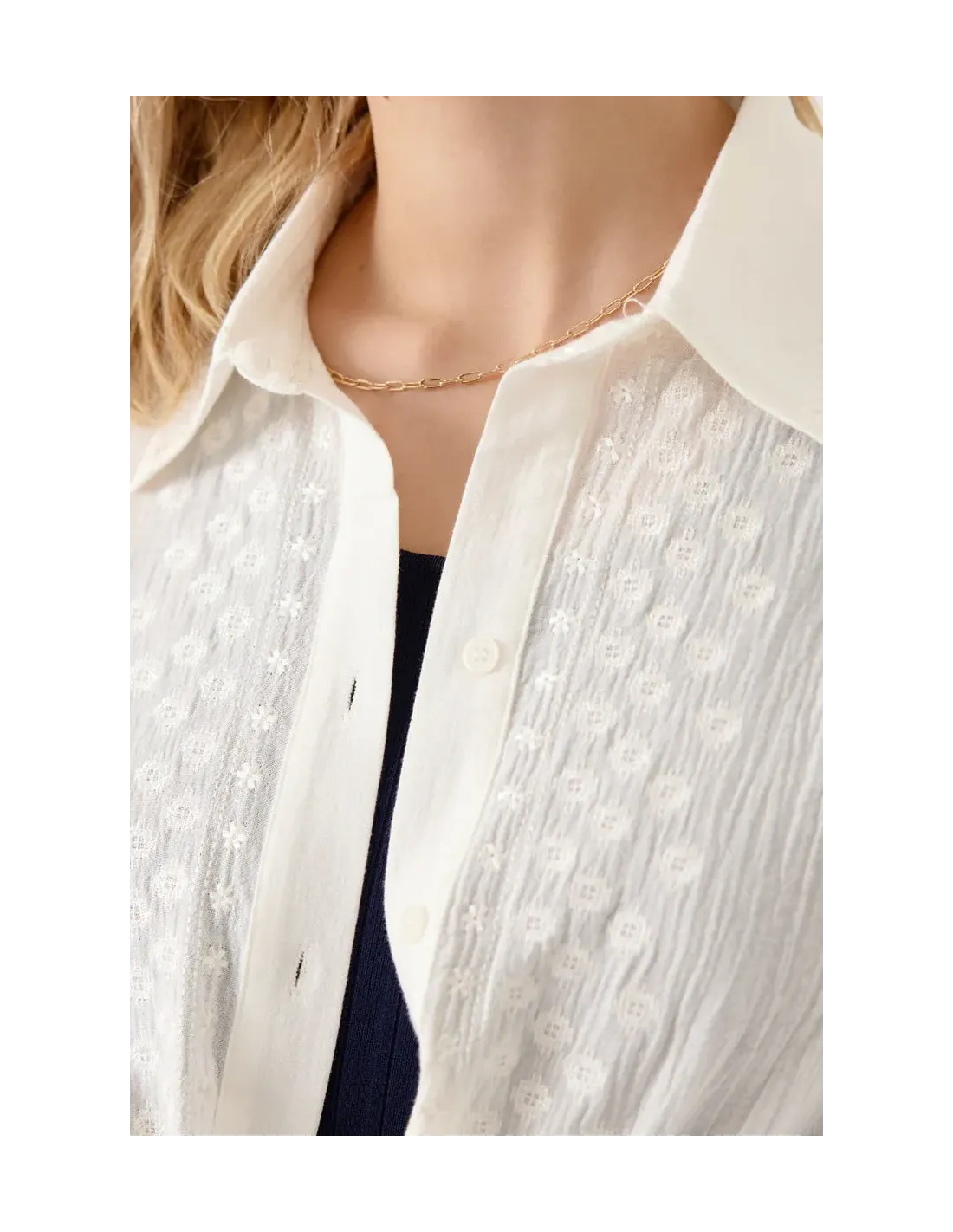 Détails de broderies ton sur ton sur le devant. Coupe droite.