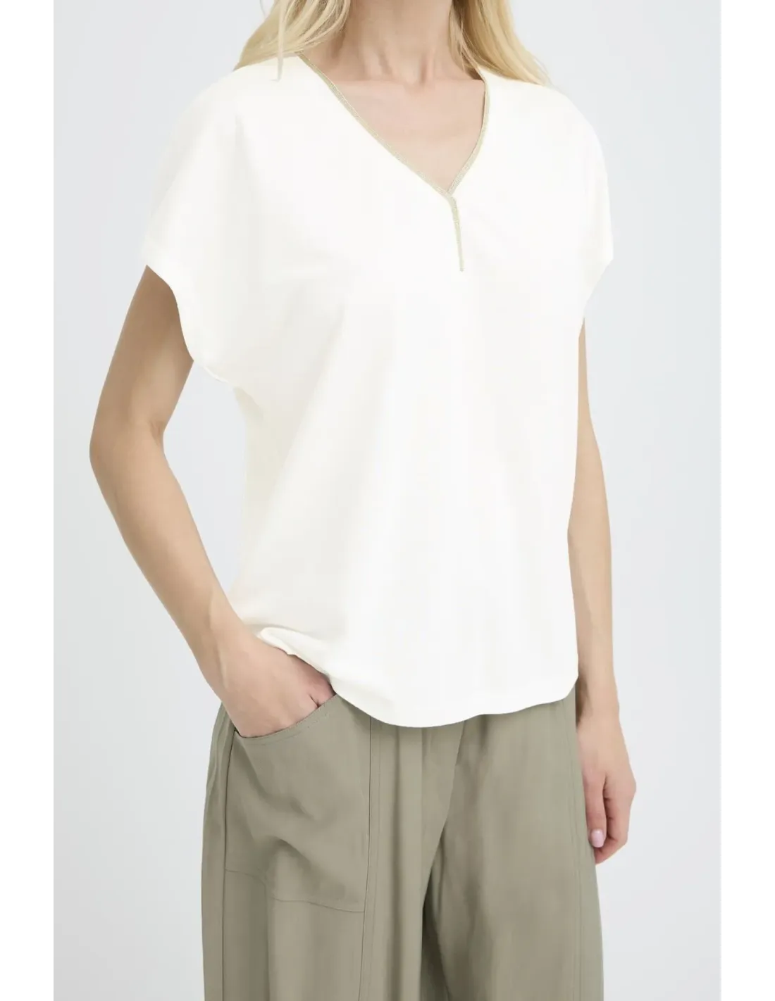 Tee shirt sans manches, col V avec liseret doré.