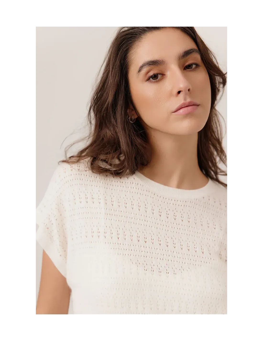 Top en maille fine, ajouré. Coupe droite et fluide. Léger et confortable.