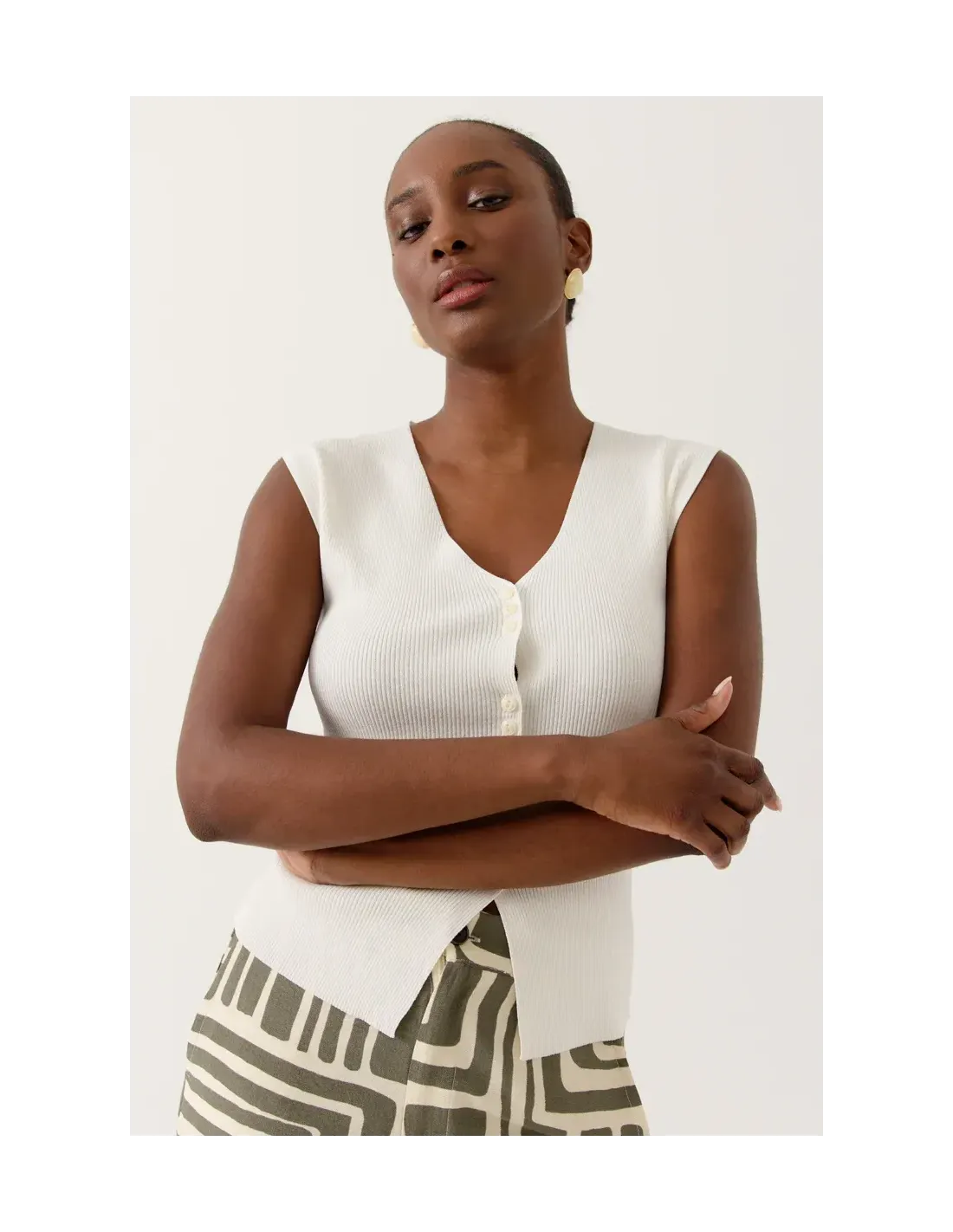 Gilet sans manches, encolure V. Fermeture boutonnée sur le devant. Coupe droite, maille fine et confortable.