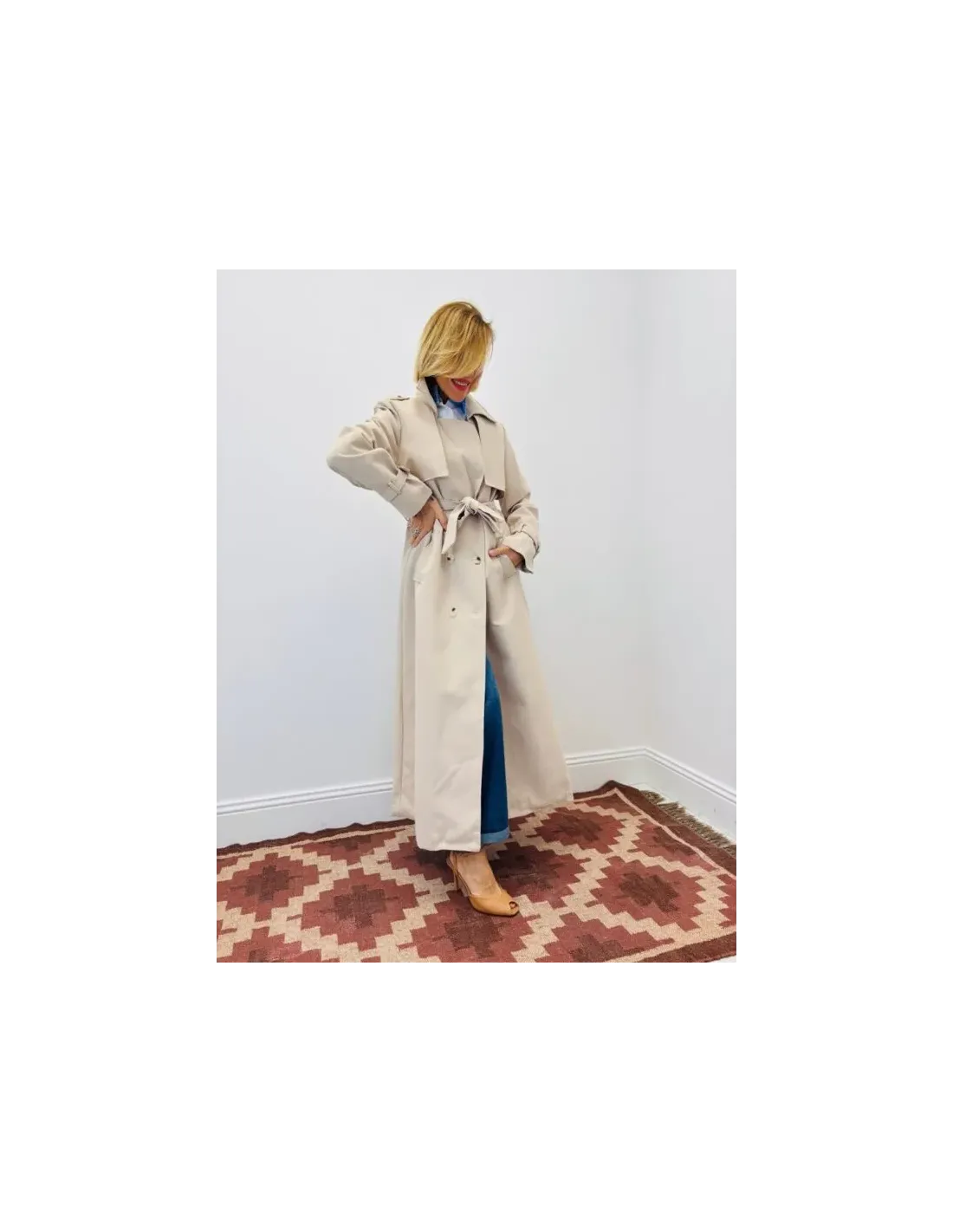 Coupe longue maxi. Double boutonnage. Ceinture à nouer à la taille. Pattes épaules et poignets ajustable. Col large structuré.