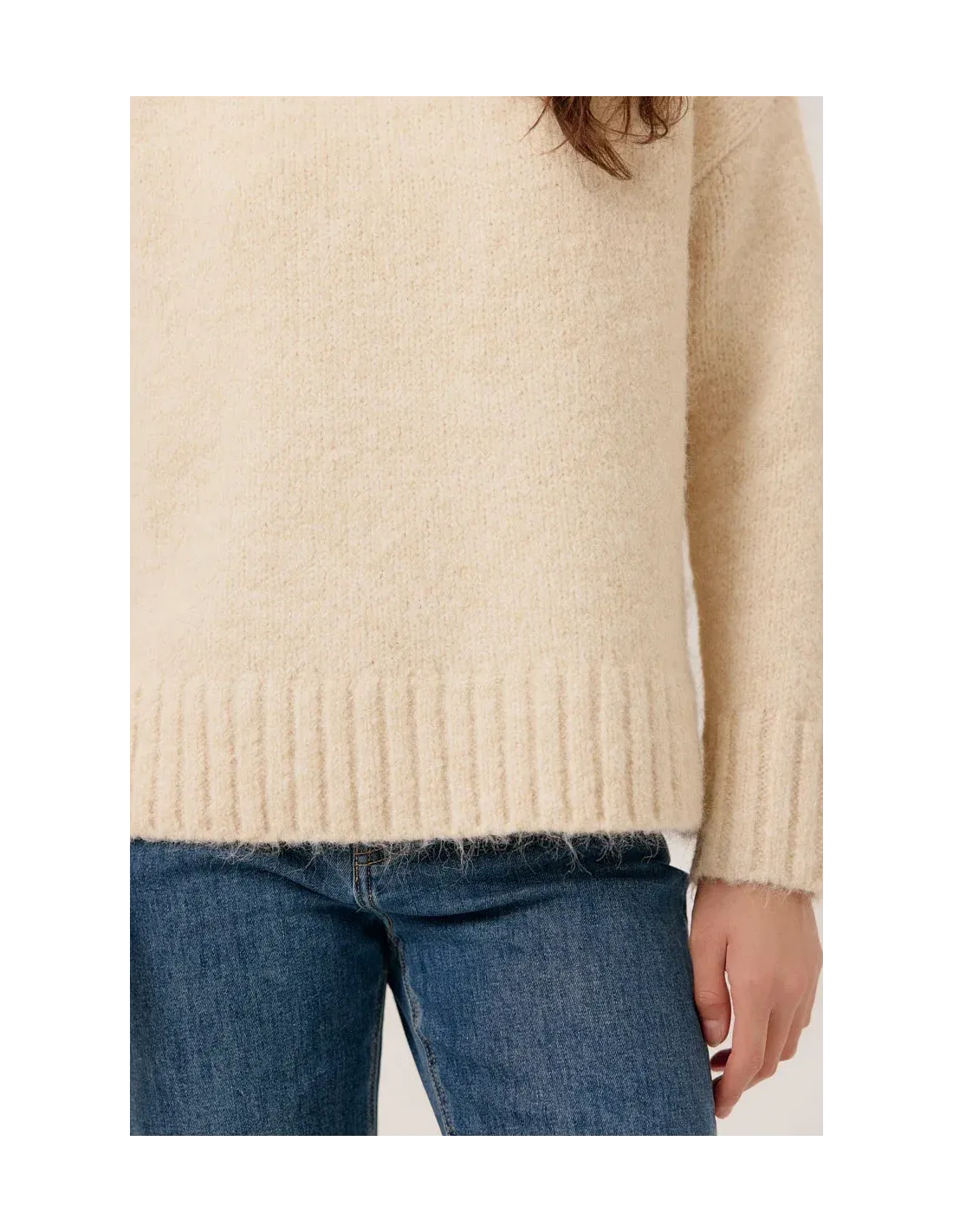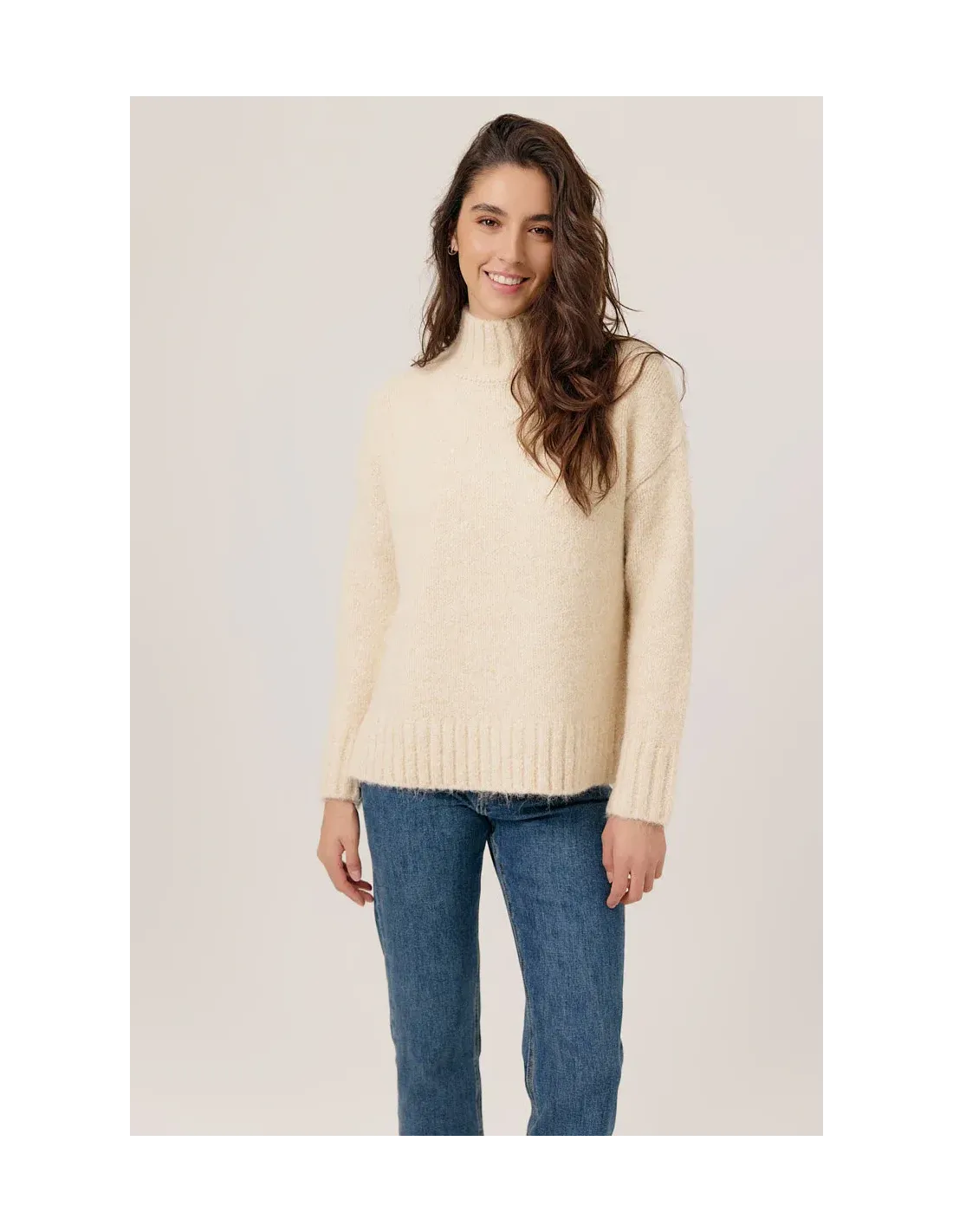 Pull en manches longues, col montant. Coupe droite et finitions cotelèes.