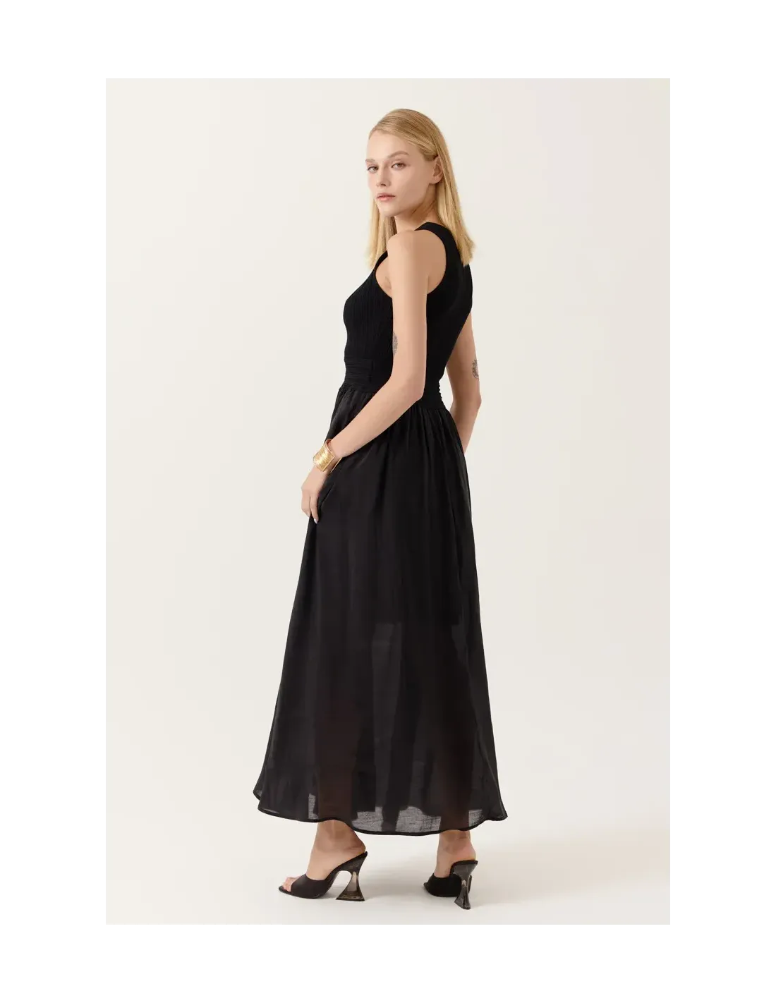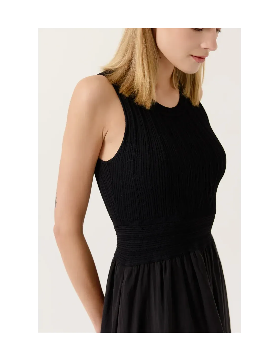 Robe longue sans manches. Encolure ronde. Haut en maille fine cotelée.