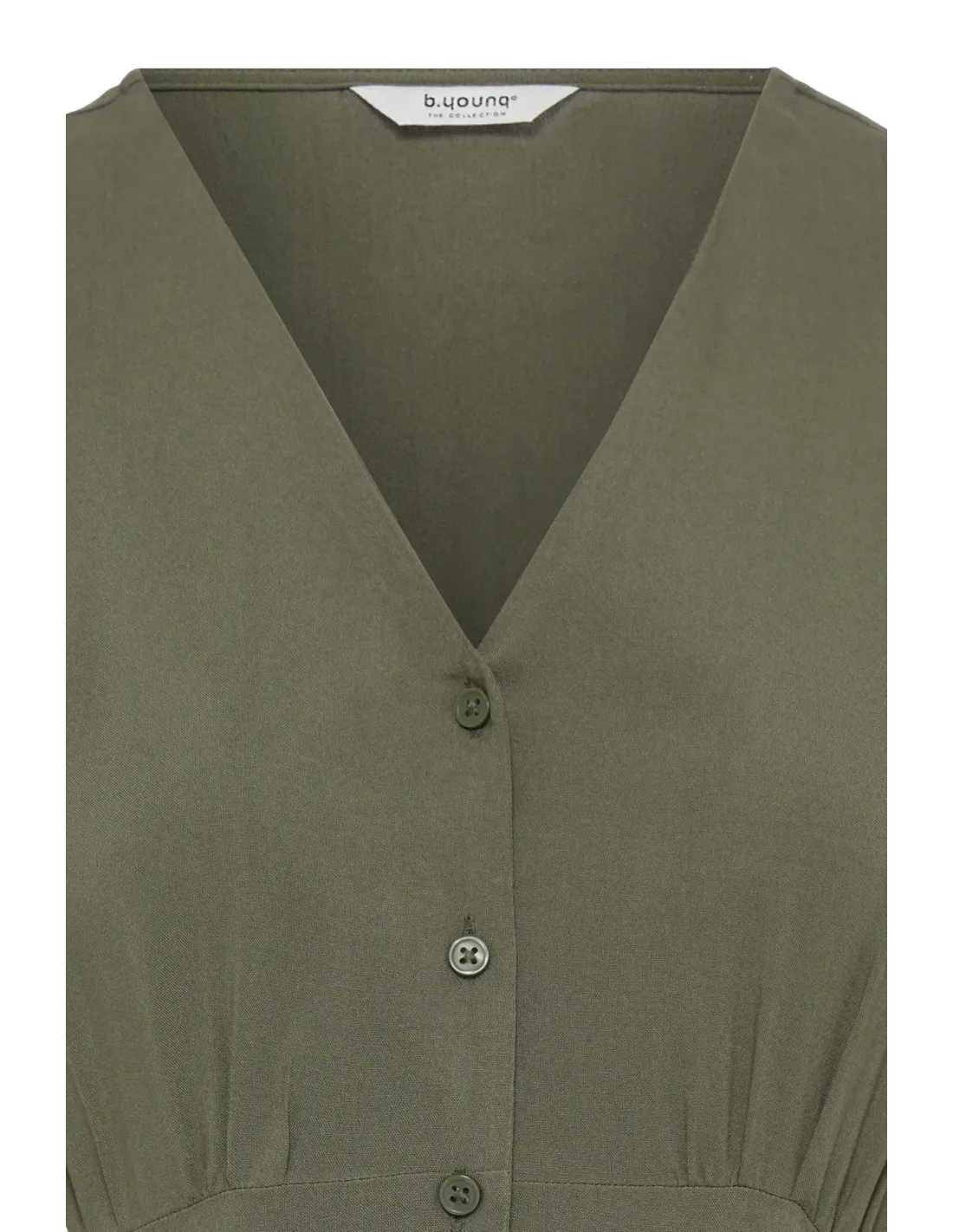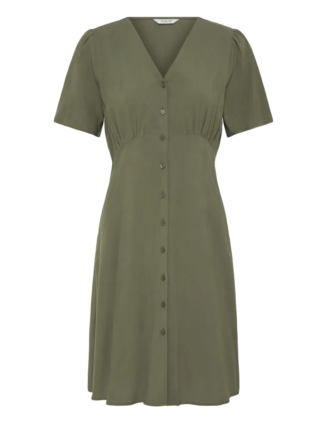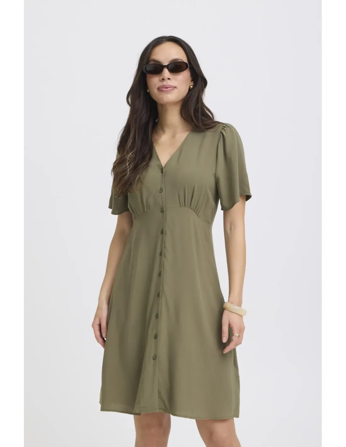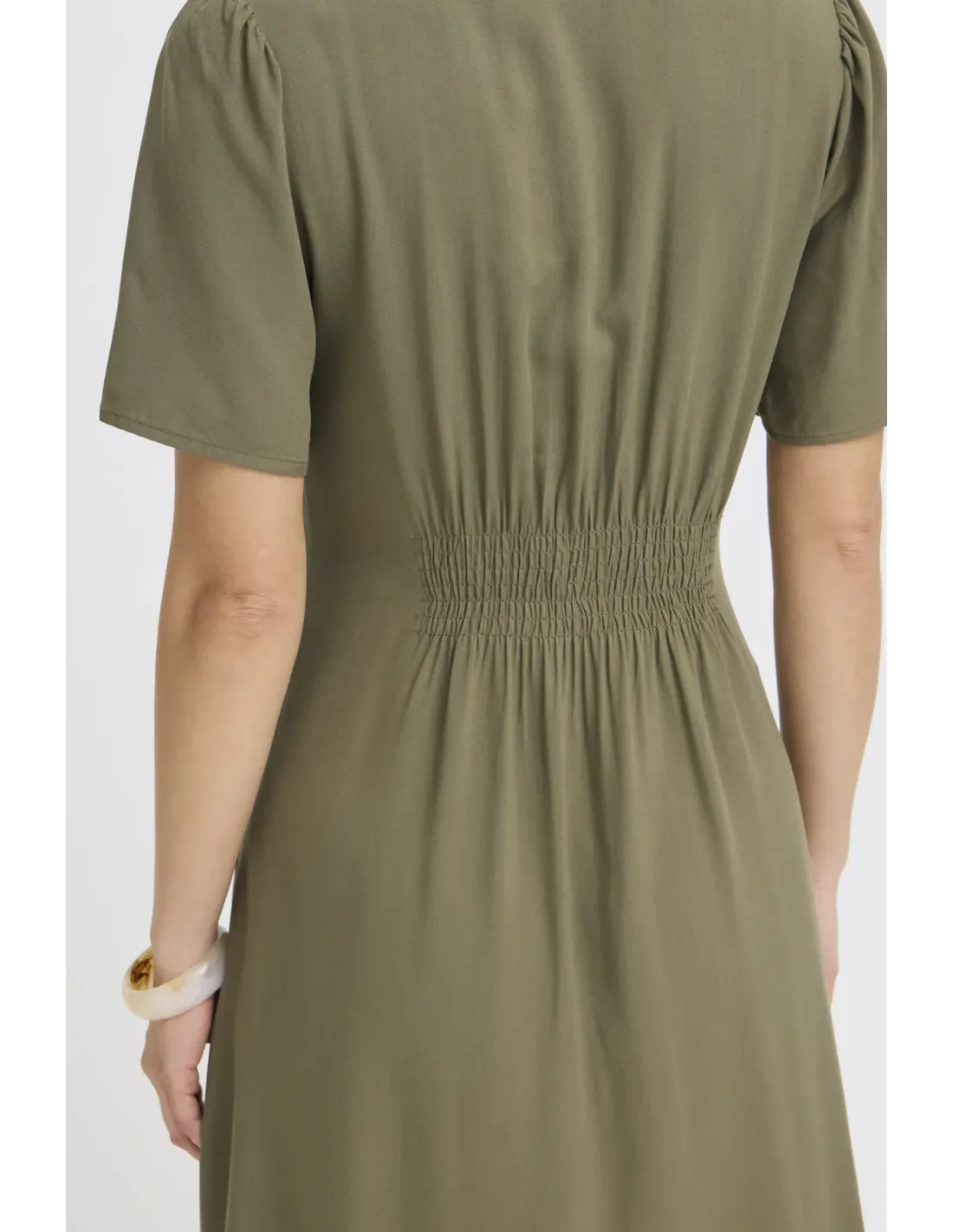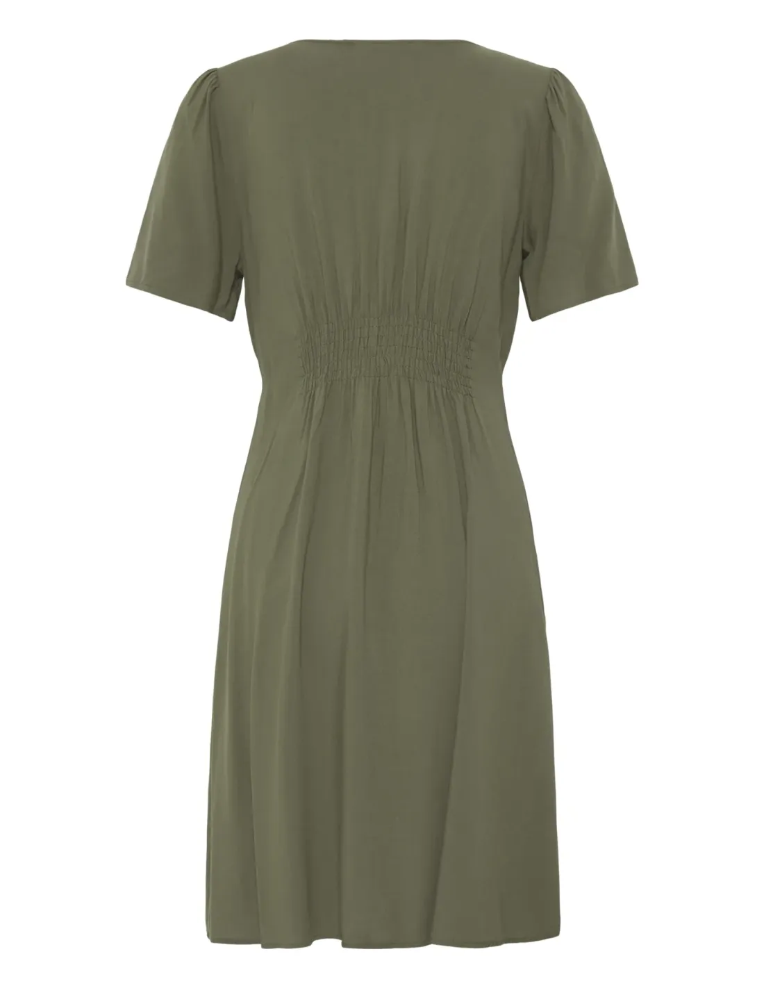 Robe manches courtes fluide, boutonnée tout au long devant, smockée à l'arrière, encolure V.