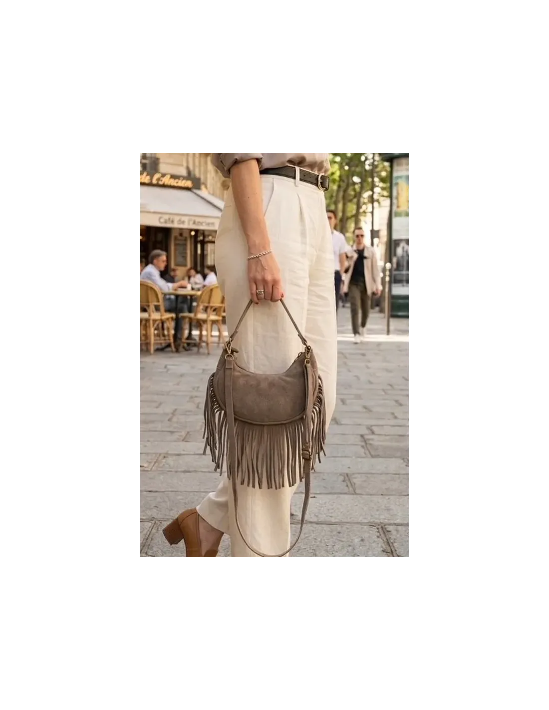 Sac à bandoulière en daim, franges, bandoulière en daim, petite poche à l'intérieur.