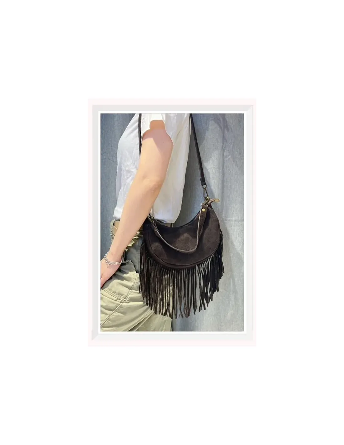 Sac à bandoulière en daim, franges, bandoulière en daim, petite poche à l'intérieur.