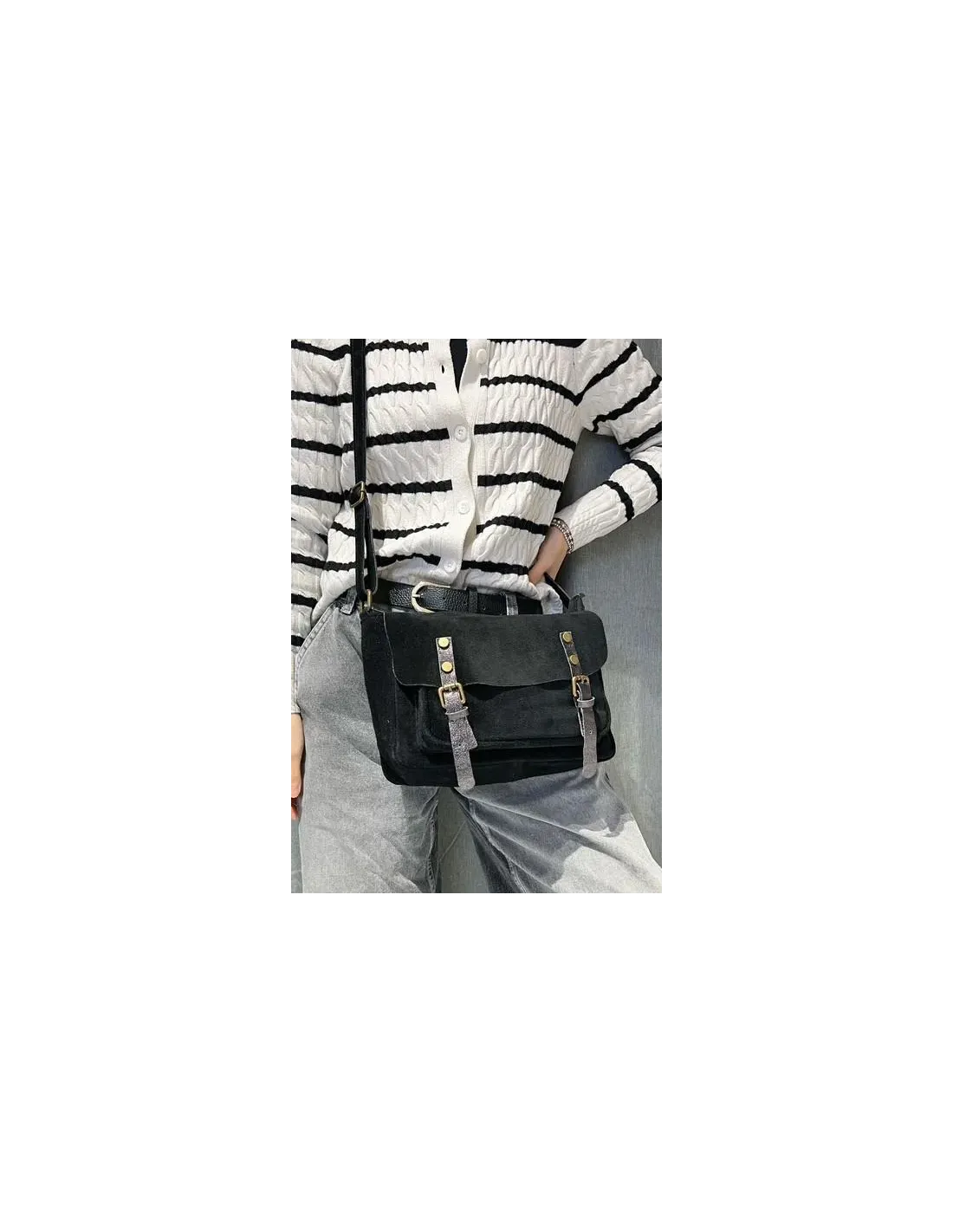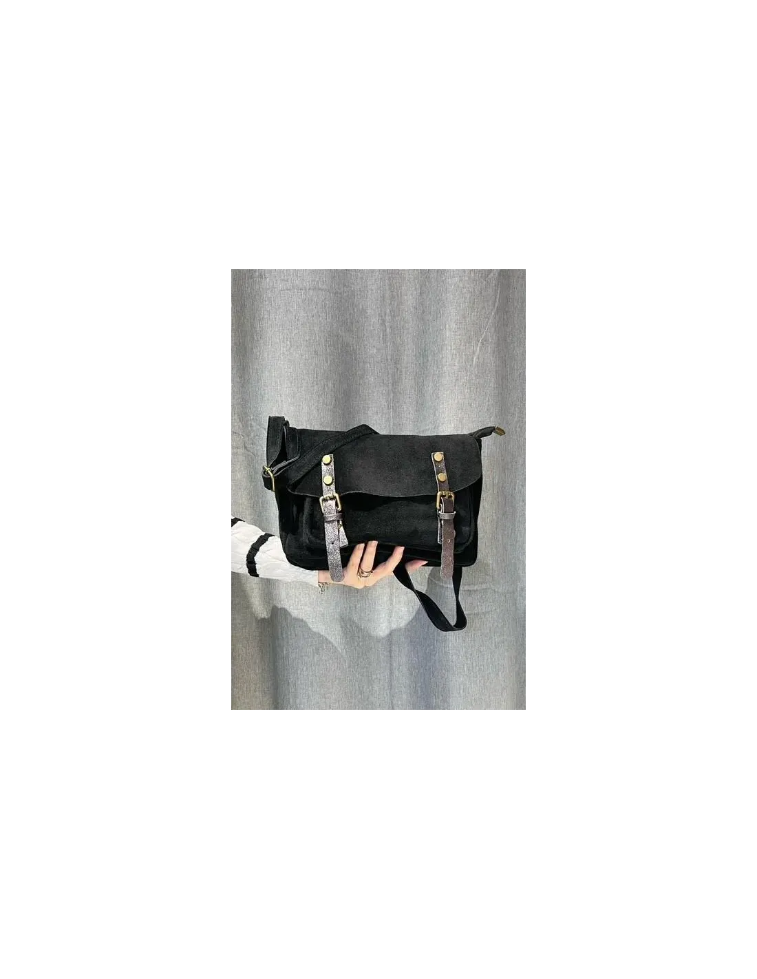 Sac forme cartable en daim, poche sur la façade, bandoulière en daim réglable fixé sur le sac.