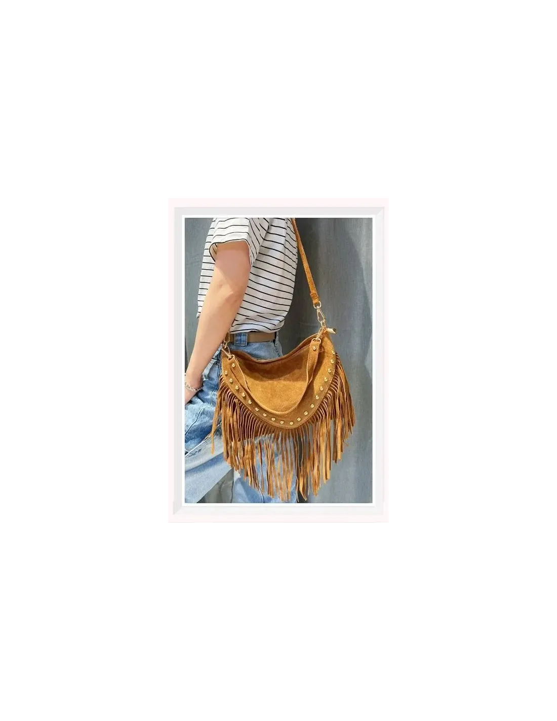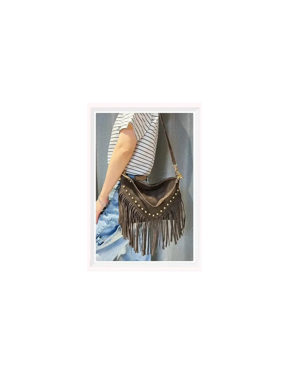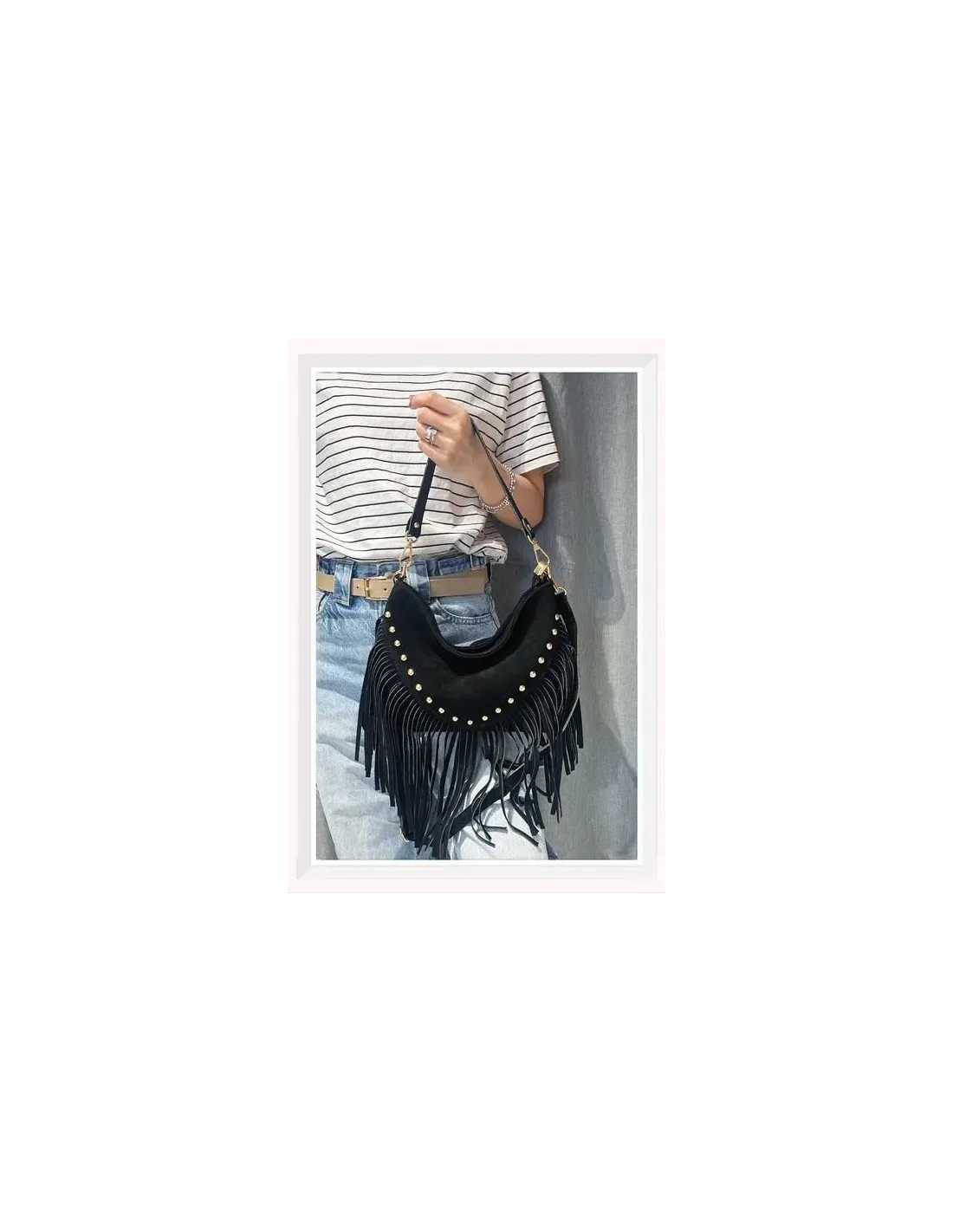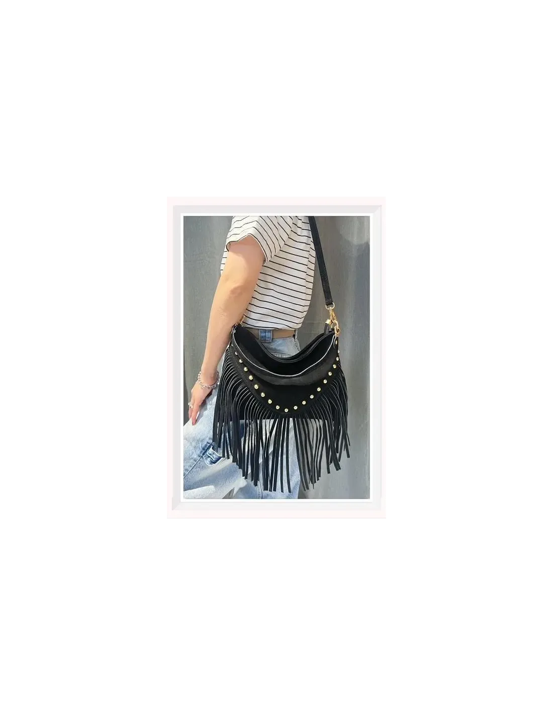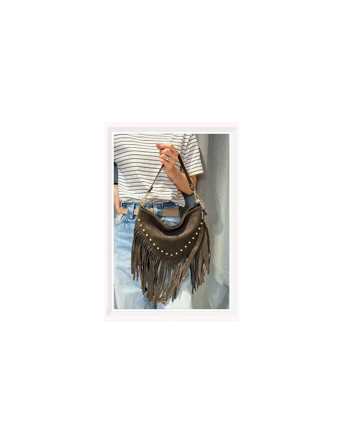Sac à l'épaule daim, cloutés et franges, bandoulière en daim incluse, poche au dos.