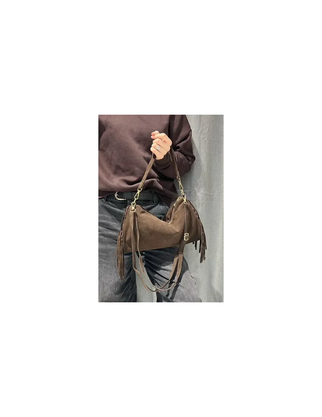 Un sac en daim italien raffiné, rehaussé de franges élégantes, à la fois pratique et stylé.- Porté main ou en bandoulière pour plus de liberté- Fermeture zippée sécurisée + poche arrière pratique- Daim italien souple & finitions haut de gammeL’allié parfait pour un look bohème-chic du quotidien aux soirées. Made in Italy .
