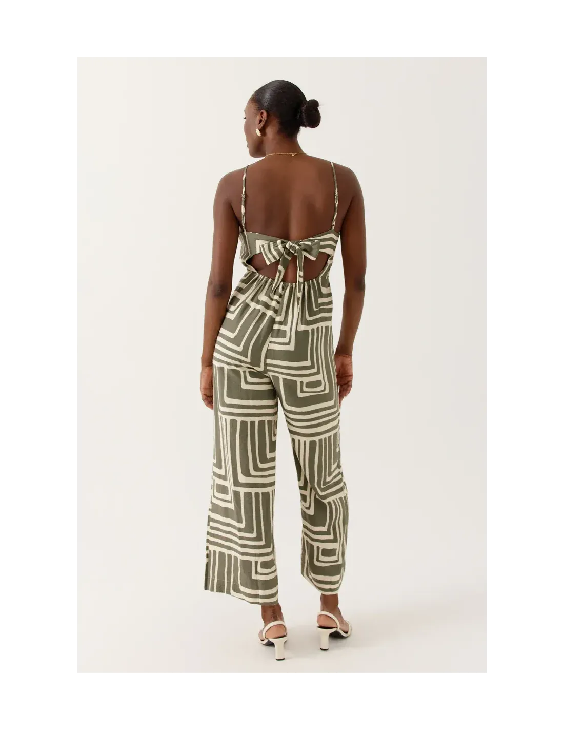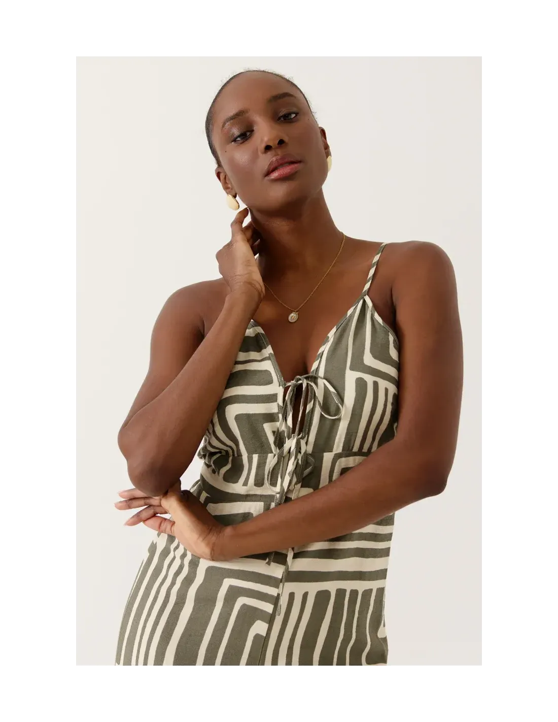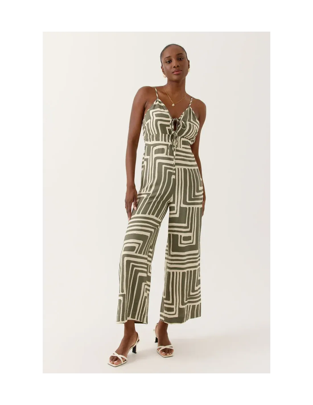 Combinaison pantalon. Jambes larges. Bretelles fines réglables. Encolure en V. Lien à nouer sur le devant.