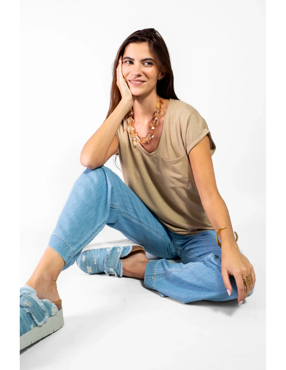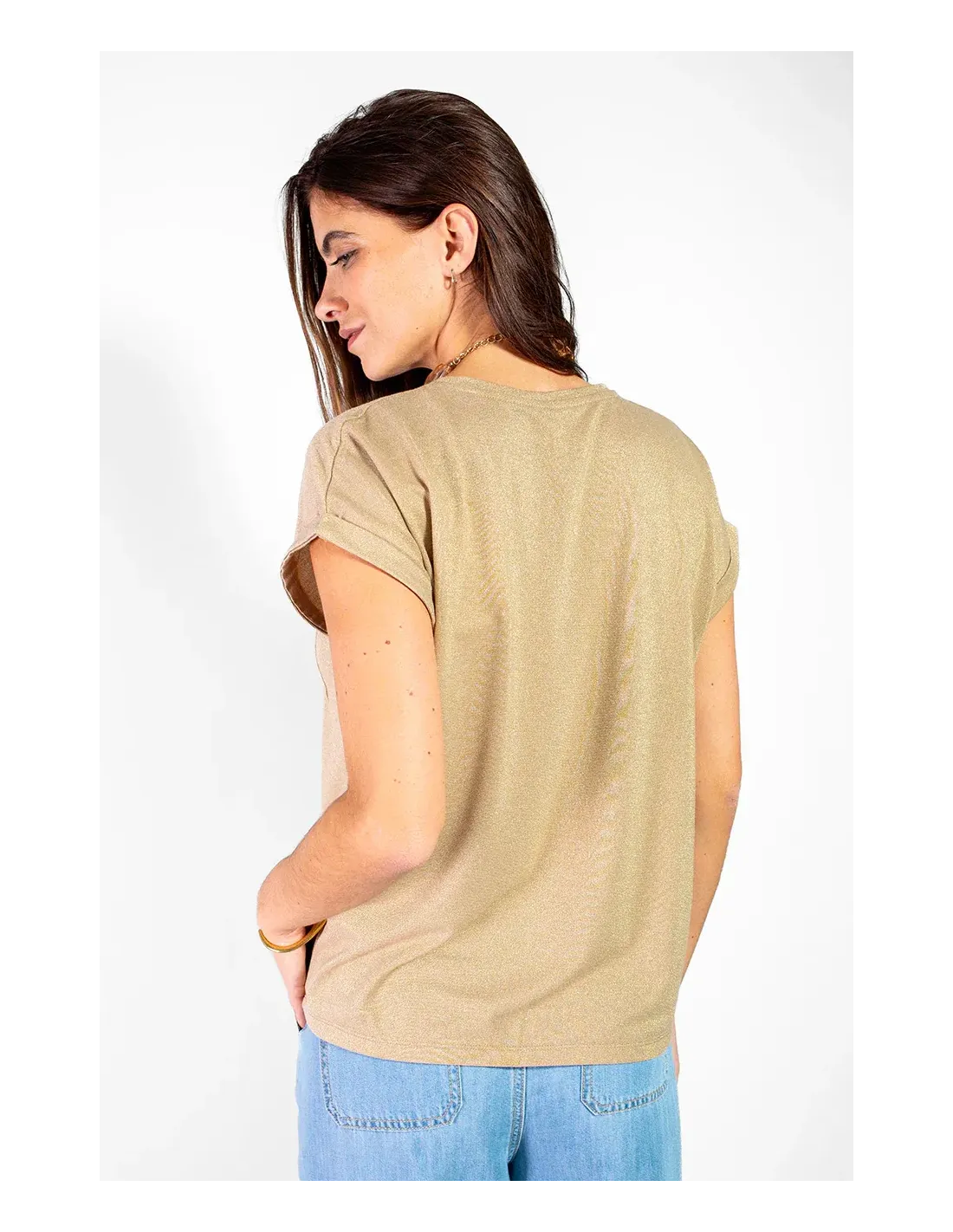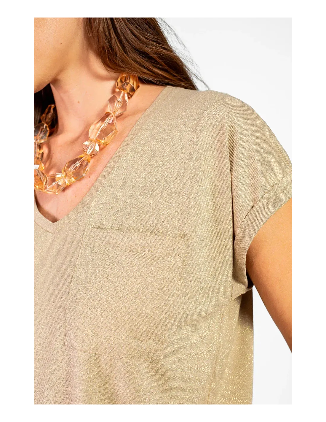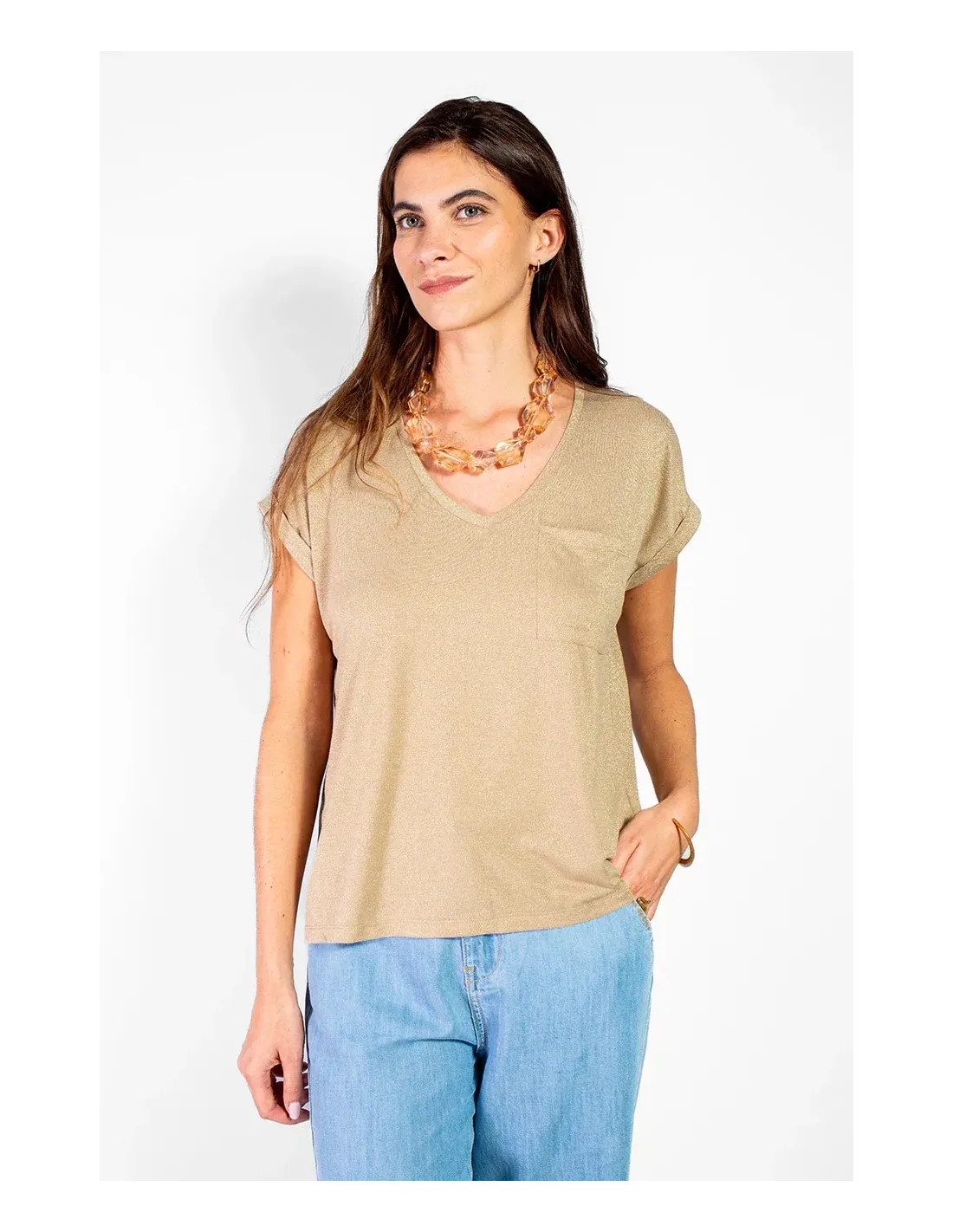 Tee-shirt, manches courtes retroussées, encolure V. Poche plaquée.