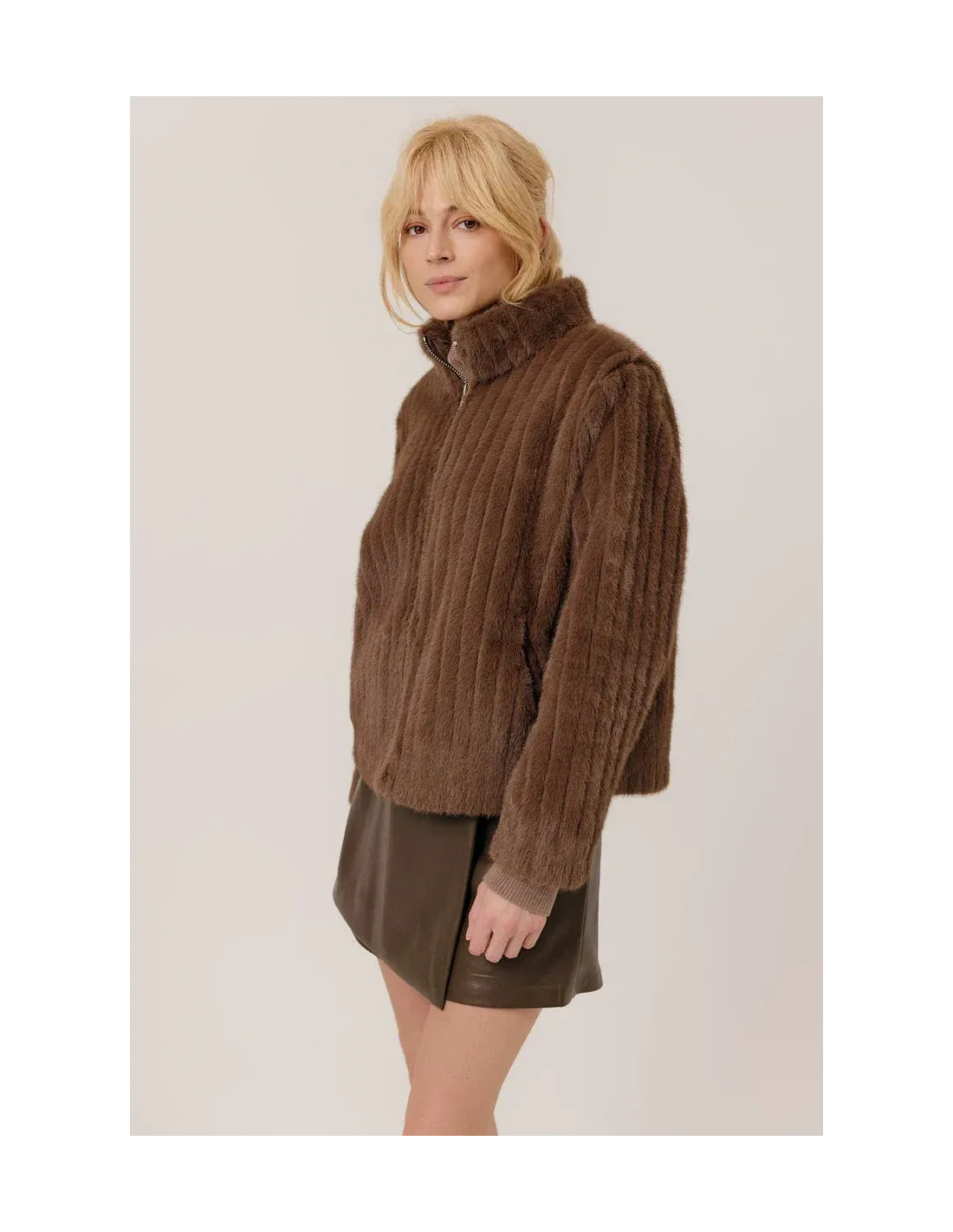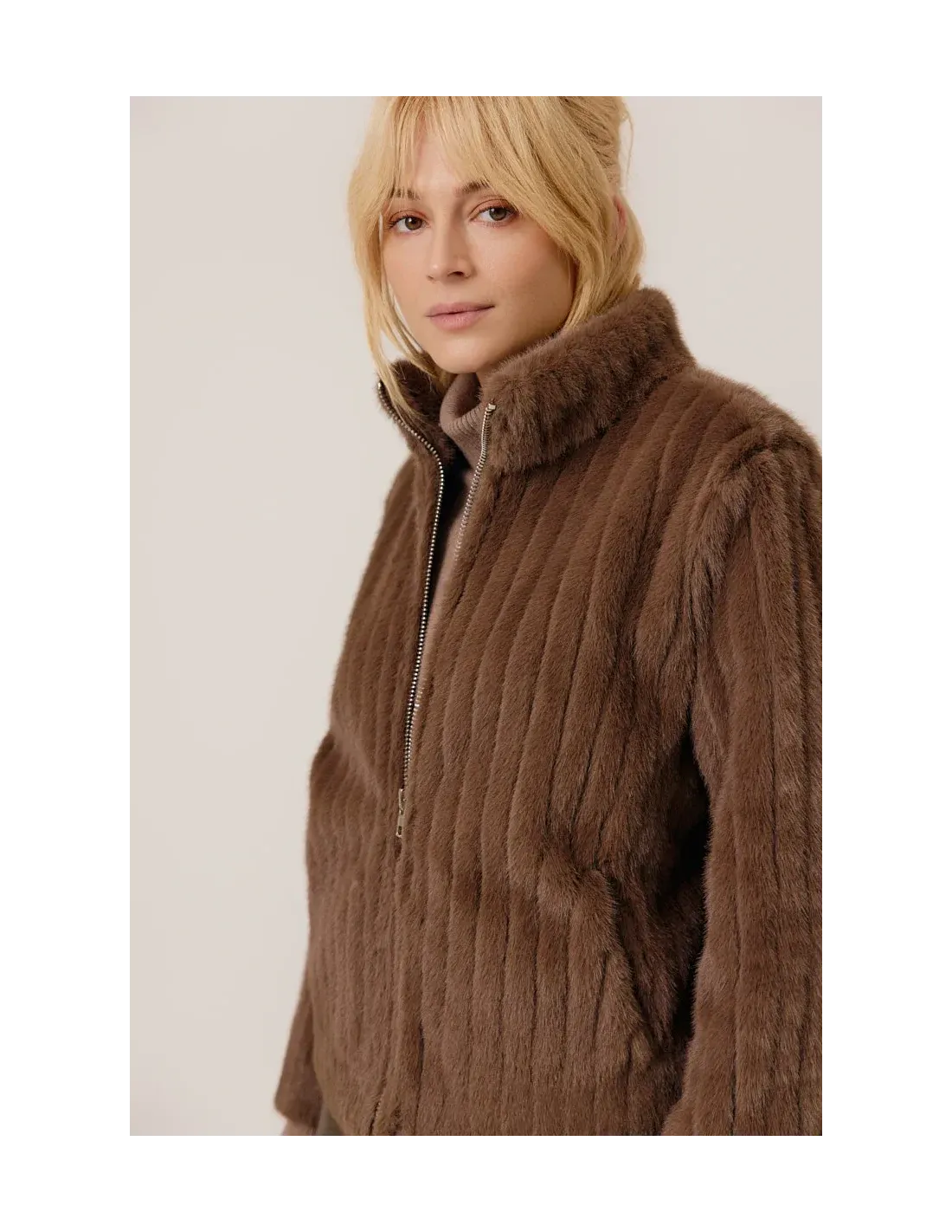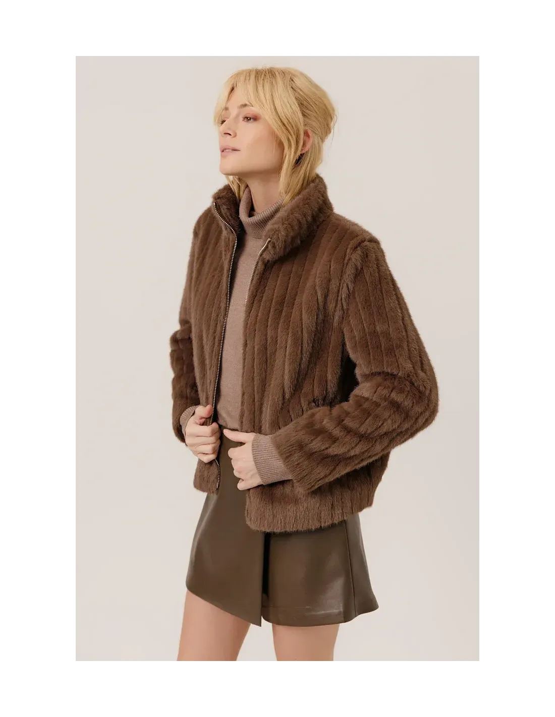 Veste courte en fausse fourrure à la texture douce et raffinée, dotée d'une fermeture zippée et d'un col montant.