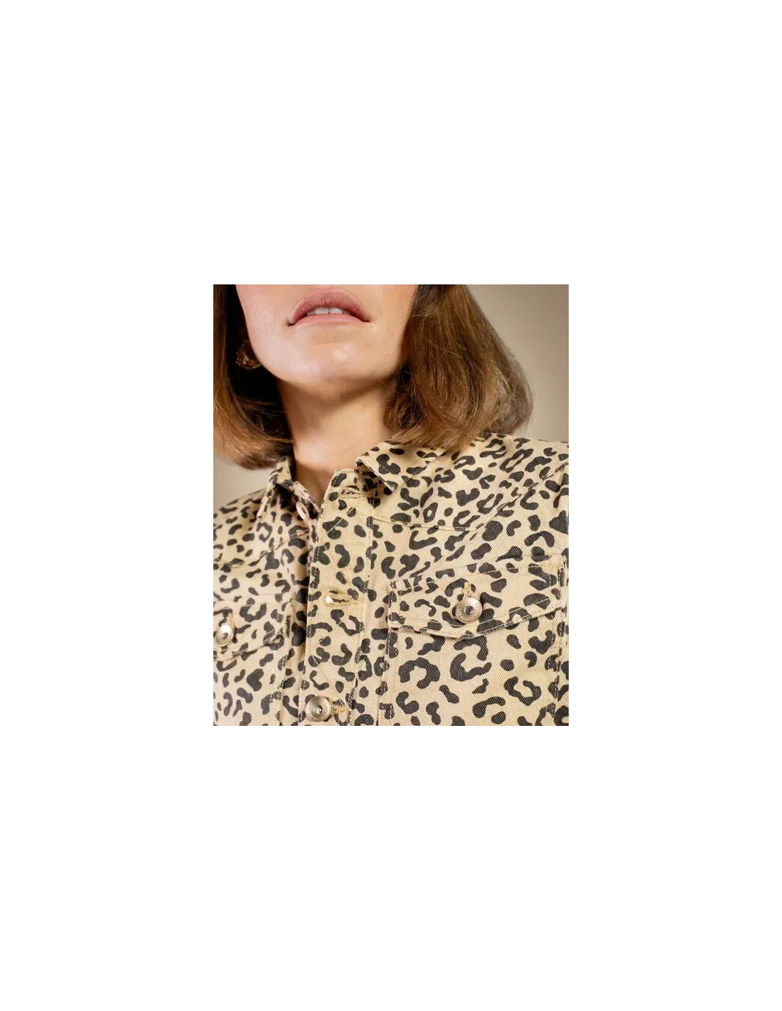Veste en jean leopard, manches longues, bas frangés, poches poitrine.